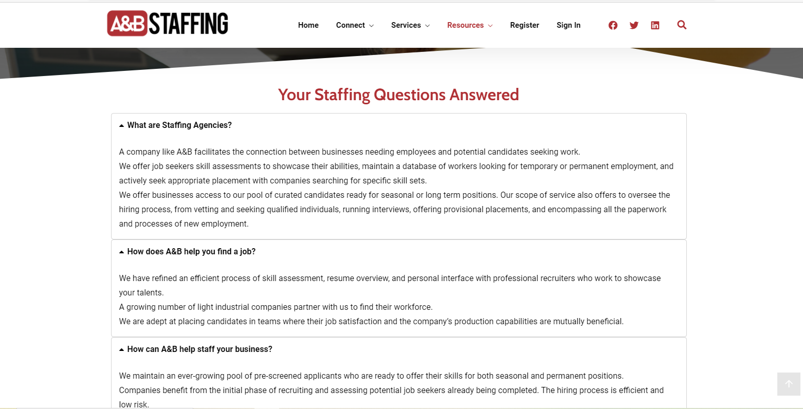 I worked with the A&B Staffing Agency to do a complete overhaul of their website. Originally, the company copy had not been written by a native English speaker, and nuances came across awkwardly.